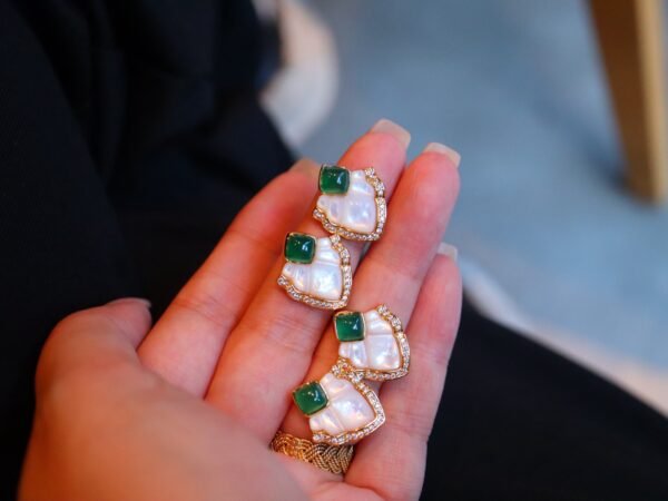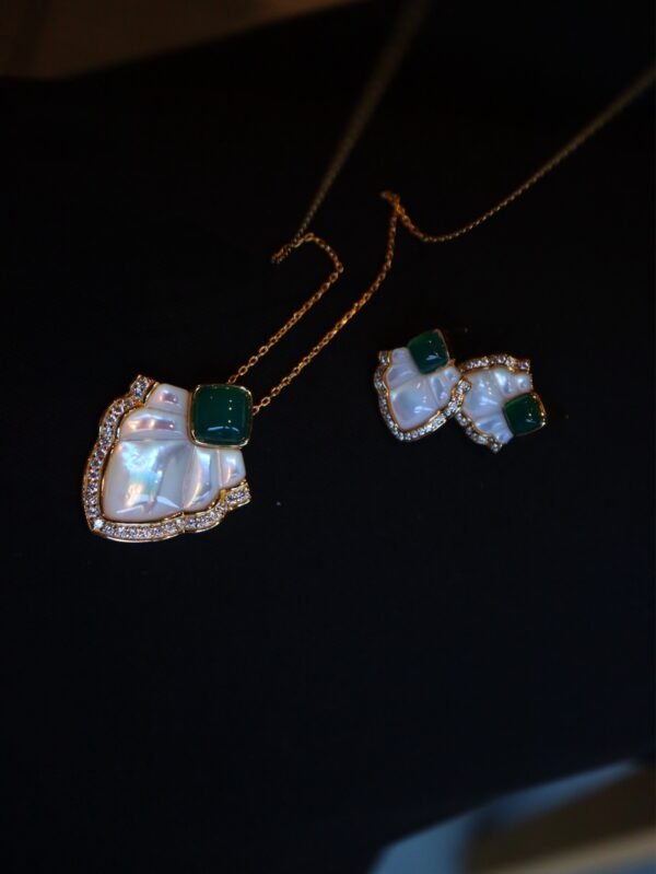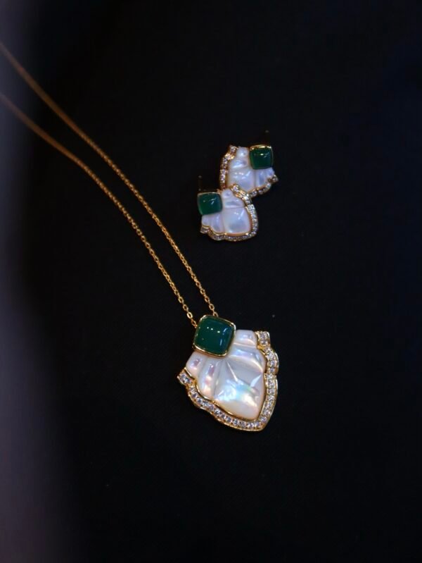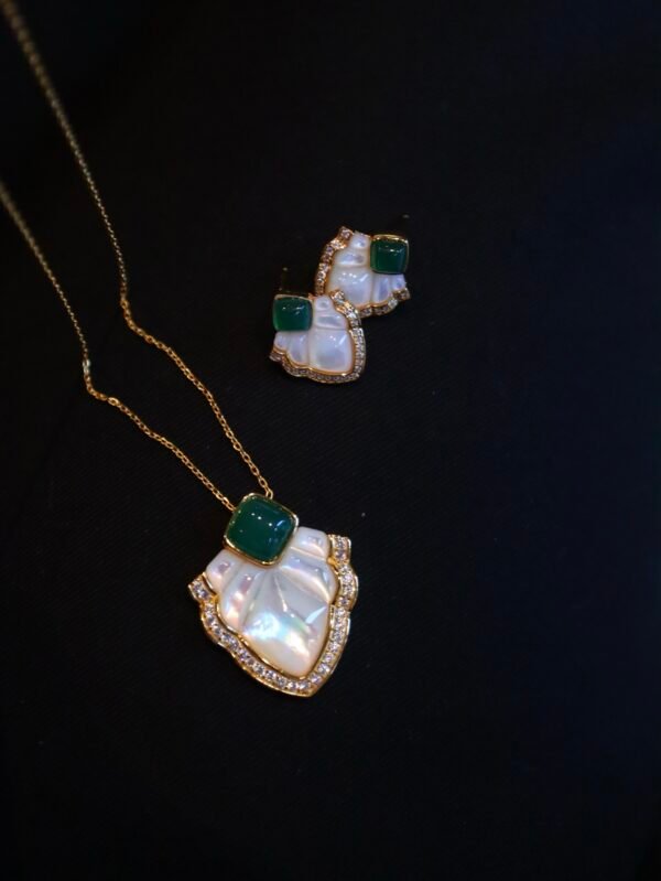 This exquisite pendant and stud earrings set combines the soft, iridescent glow of white mother-of-pearl with the deep, rich hue of green onyx, beautifully accented by brilliant zirconia stones.