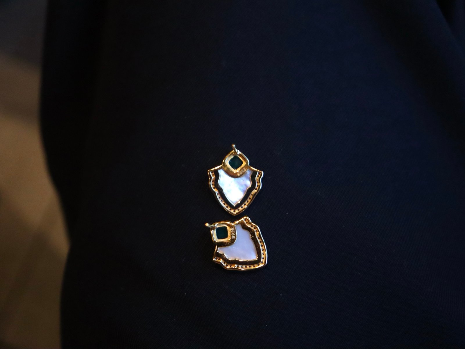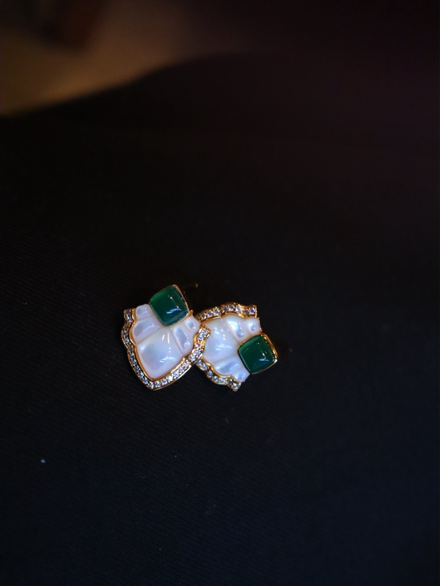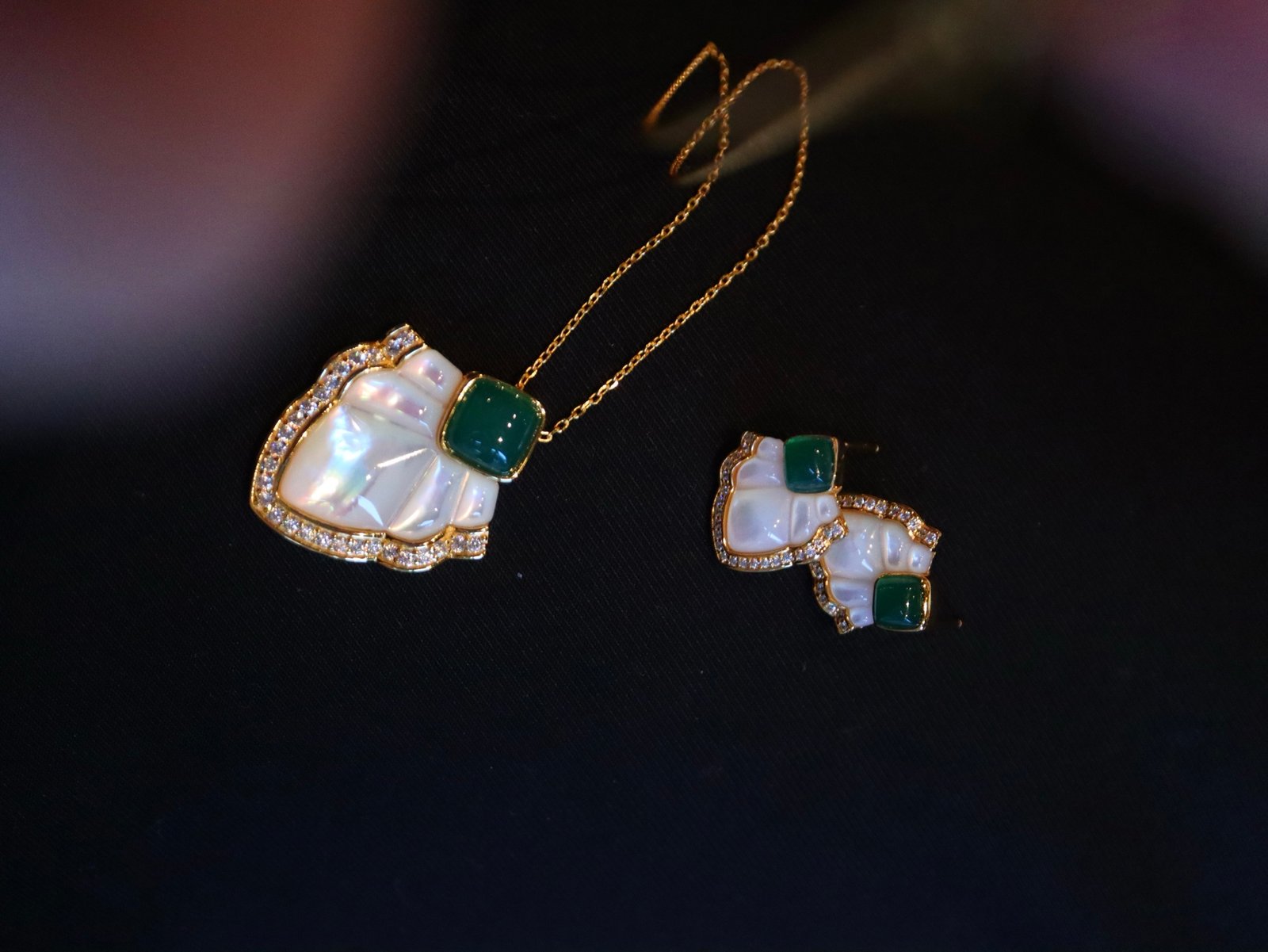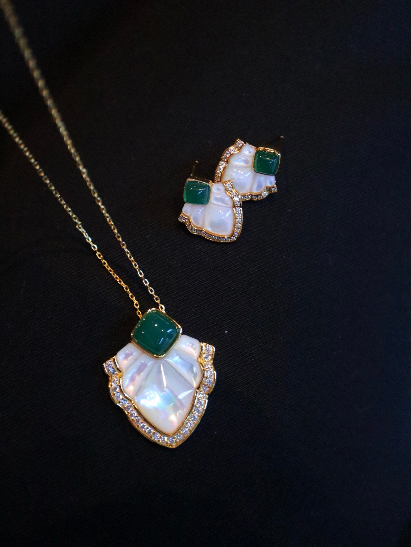This exquisite pendant and stud earrings set combines the soft, iridescent glow of white mother-of-pearl with the deep, rich hue of green onyx, beautifully accented by brilliant zirconia stones.